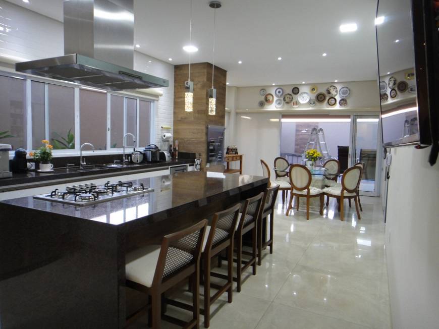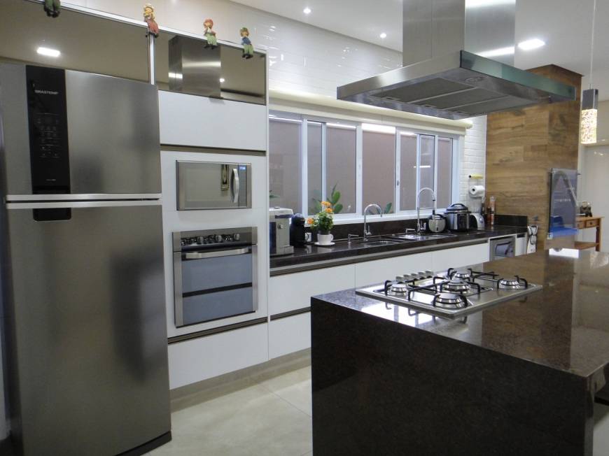 Área Gourmet com ilha e bancada em granito café imperial, metais Deca, coocktop, exaustor, forno elétrico e micro-ondas embutidos, churrasqueira em aço inox GiraGrill, modelo Elevgrill 584
