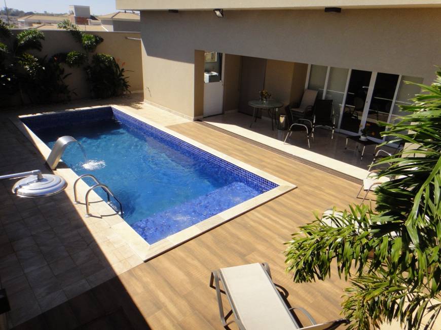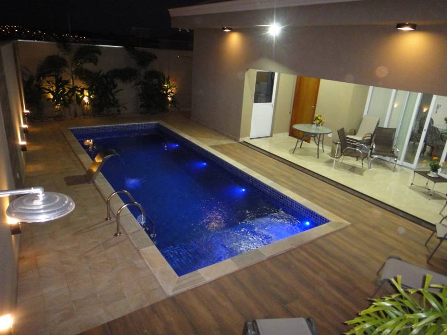 Piscina com estrutura de concreto e revestimento em pastilhas, tamanho 8,0m x 3,0m x 1,5m, com cascata e hidromassagem e sistema de aquecimento e de iluminação.